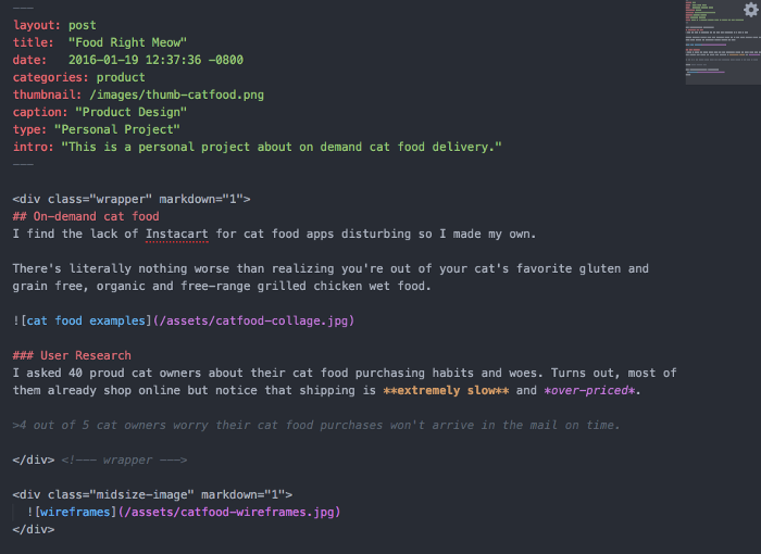 À quoi sert un portfolio sans démonstration de notre travail ? Écrivons un article à propos de mon side-projet d’application de livraison de nourriture pour chat, Food Right Meow. Dans le dossier _posts, je vais créer un nouveau fichier Markdown en utilisant la convention ANNEE-MOIS-JOUR-titre2. Le fichier de mon article est donc nommé 2016-11-10-livraison-nourriture-chats.markdown.