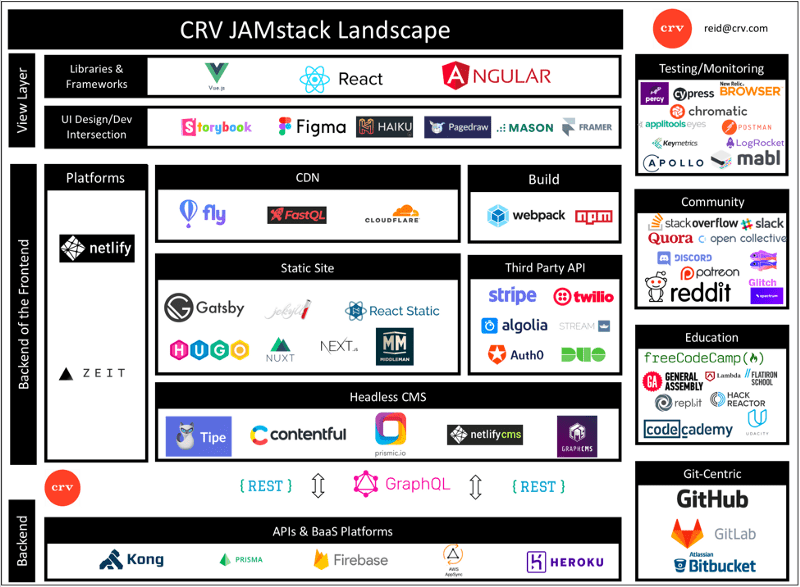 Les tendances du développement frontend et le changement architectural qui en résulte est très prometteur pour l'écosystème des startups et des capital-risqueurs. CRV aime prendre des risques au plus tôt, et a déjà investi dans 6 startups qui font partie du paysage de la Jamstack (dont 3 qui seront annoncées publiquement très bientôt). Si vous êtes un créateur de startup lié à cet écosystème, un investisseur ou que vous voulez simplement papoter, écrivez à reid@crv.com.
